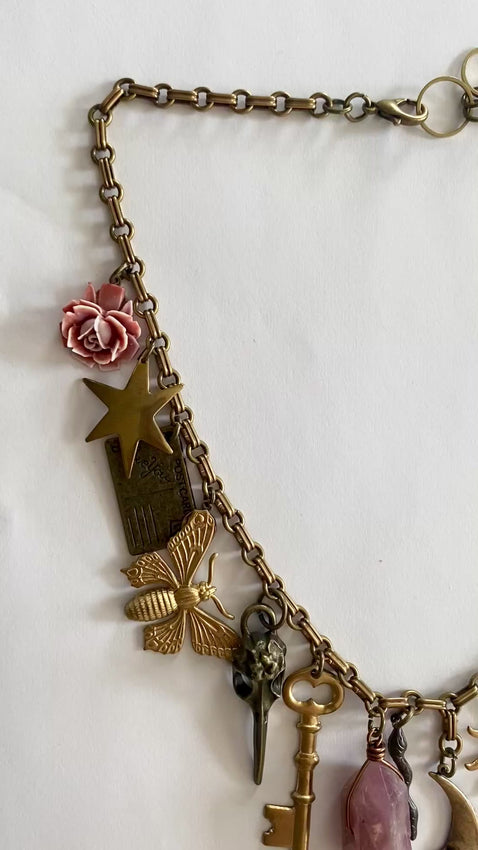 Whimsigoth Charm necklace HANDMADE BY ME! ~ brass vintage chain with brass + oxidized brass charms hanging. Gorgeous mother of Kunzite pointed chunk +vintage flowers. sooo cute for summer! 18” long and adjusts up to 20”. Can also clasp shorter easily on chain!