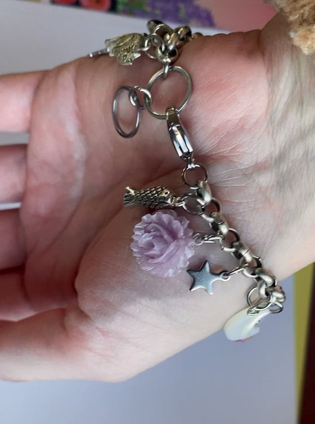 y2k vibes Charm bracelet HANDMADE BY ME! ~ silver plated non tarnish chunky rolo chain with vintage + new charms + cameos + mother of Pearl stars + freshwater pearls hanging. Vintage iridescent glass cameos. Gorgeous silver, irididescent + lilac color palette, sooo cute for summer! 7.5” + adjusts to 8”, please let me know if you need a shorter or longer chain and I’ll adjust accordingly. I have smaller wrists and this one is a bit large on me!