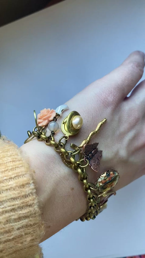 Charm bracelet HANDMADE BY ME! ~ copper vintage chunky rolo chain with vintage + new charms + cameos hanging, as well as Aventurine gemstone chunks + cameo. Gorgeous seafoam green + copper palette , sooo cute for summer! 7.25+ adjusts to 7.75”, please let me know if you need a shorter or longer chain and I’ll adjust accordingly. I have smaller wrists and this one fits pretty well on me!
