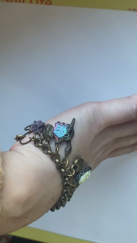 Charm bracelet HANDMADE BY ME! ~ oxidized brass vintage chunky rolo chain with vintage + new charms + cameos hanging, as well as a gorgeous Moodstone in the center that changes color while wearing it. Easier to see in the video. Gorgeous brass, black, purple color palette, sooo cute for summer! Gorgeous ox brass, black 7.25+ adjusts to 7.75”, please let me know if you need a shorter or longer chain and I’ll adjust accordingly. I have smaller wrists and this one fits pretty well on me!