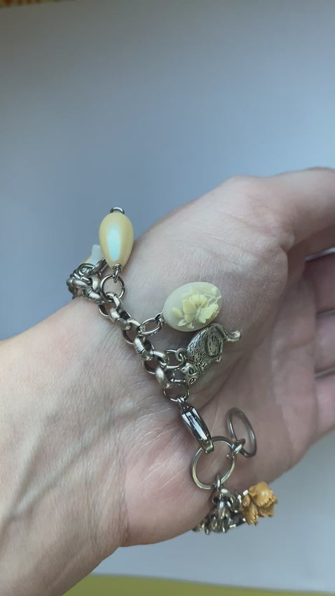 Handmade by me - Whimsical + coquette brass rolo chain charm bracelet featuring a mix of vintage cameo charms, mother of pearl star + vintage flowers. Center gray glass cat’s eye cameo. Gorgeous brass, white, peach, gray color palette. Vintage raw brass chain, 8” long and adjusts to 8.5” . Please let me know if you need a shorter or longer chain and I’ll adjust accordingly!