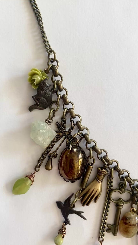 Nature Whimsigoth Charm necklace HANDMADE BY ME! ~ oxidized brass vintage chain with vintage + new charms + cameos hanging. Gorgeous Czech glass leaves + drops, Czech glass cameo, center brown glass cars eye cameo, vintage light green cameo, vtg flowers + tiny cameo. So chunky and maximalist, chimes beautifully while wearing. sooo cute for summer! 18” long and adjusts up to 20”. Model is wearing necklace on shortest link.